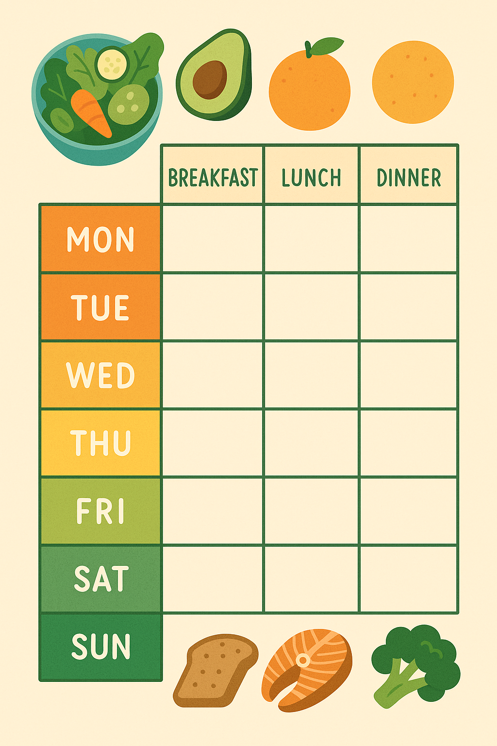 | 월 | 귀리죽 + 삶은 달걀 1개 + 블루베리 한 줌 | 현미밥 + 두부조림 + 미역국 + 시금치나물 | 보리밥 + 고등어구이 + 채소무침 + 배 1/2개 |
