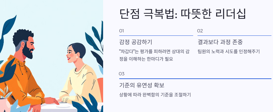 지나치게 통제하려 하거나, 상대 의견을 무시하면 팀의 사기가 떨어질 수 있습니다.