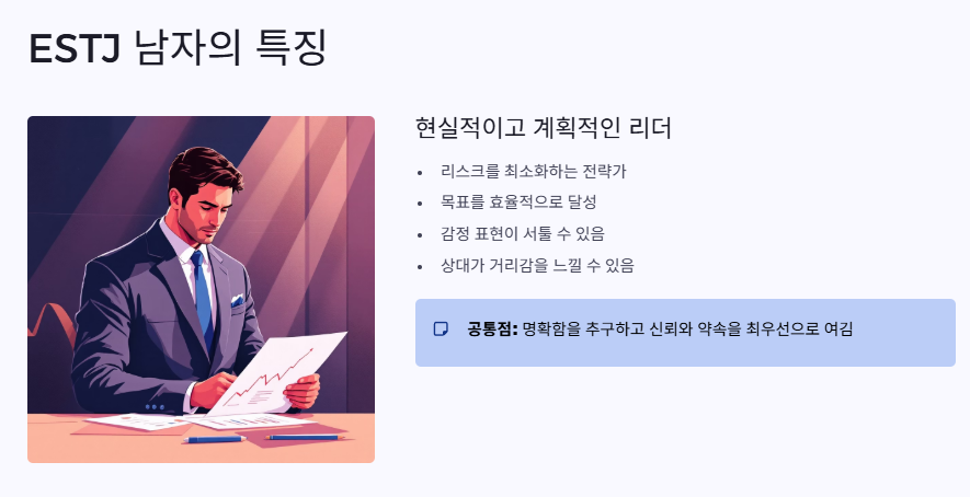 ESTJ는 ‘현실주의 리더형’으로 불리며, 책임감이 강하고 계획적인 성격이에요.