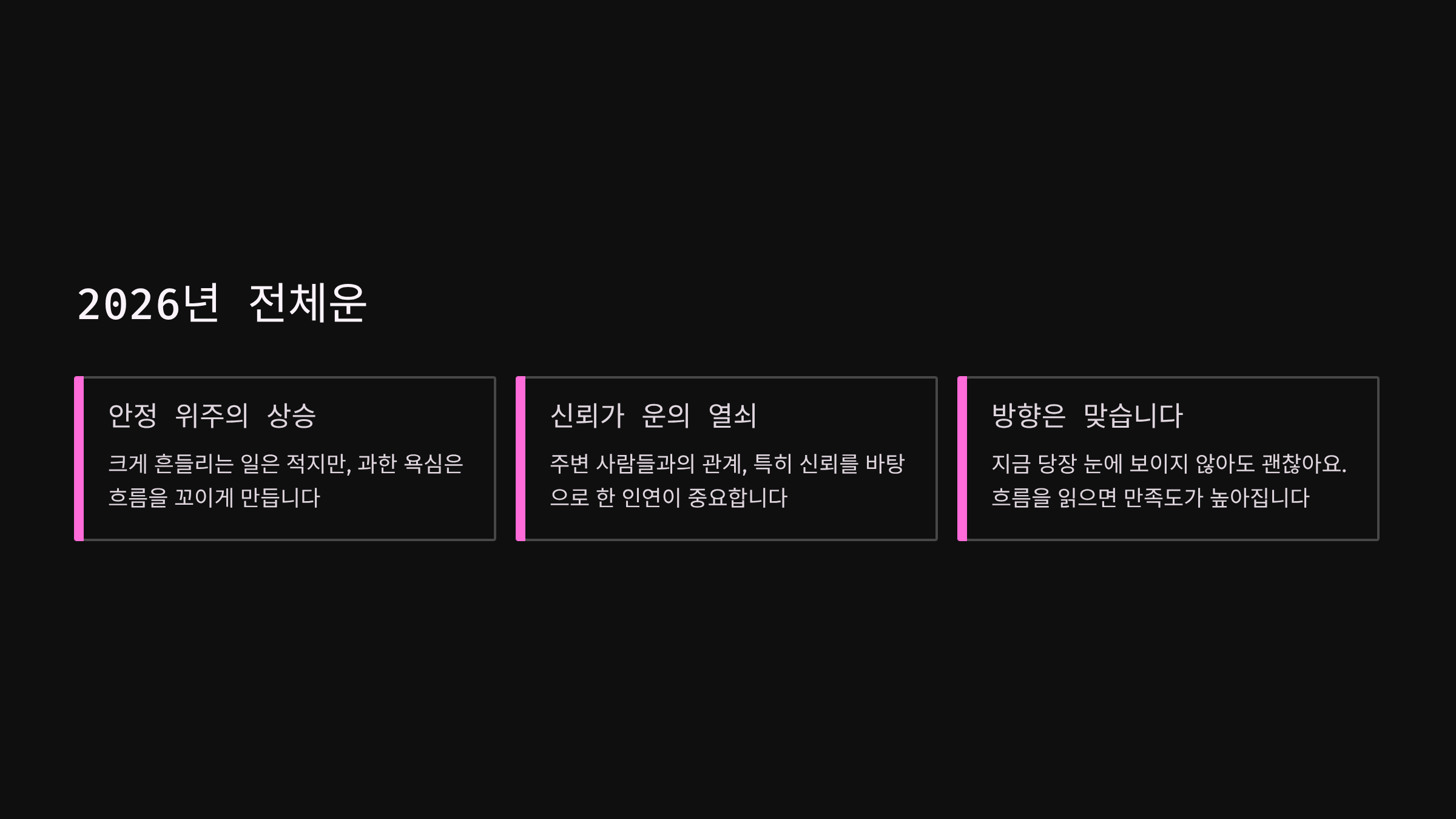 | 12월 | 한 해를 정리하는 시기. 욕심보다 안정에 집중할수록 좋습니다. |