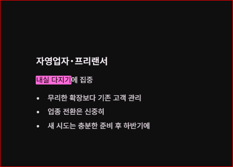 자영업자와 프리랜서의 경우 무리한 확장이나 업종 전환보다는 기존 고객 관리와 내실 다지기에 집중하는 것이 좋습니다. 새로운 시도는 충분한 준비 후 하반기에 접근하는 것이 안전합니다.